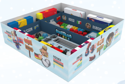 あらかじめパンチングされ、バイアスロン選手が描かれた4つのインサートピースを使用して、ボックスの内側にフレームを作り、ボックスの側面にある対応するフレームと合わせます。 バイアスロンブラストのロゴが入っている5枚目を中央に置き、箱を2つに分けます。 |
