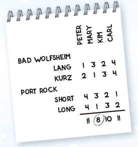 スコアリング:1位は1点、2位は2点、同様に6位まで続けます。勝者がフィニッシュする前に脱落した選手は、残りの選手の中で最下位にランクされます。例えば、4人レースで最初に脱落したプレイヤーが4位になります。後で他のプレイヤーが敗退した場合、そのプレイヤーは3位にランクインします。 |