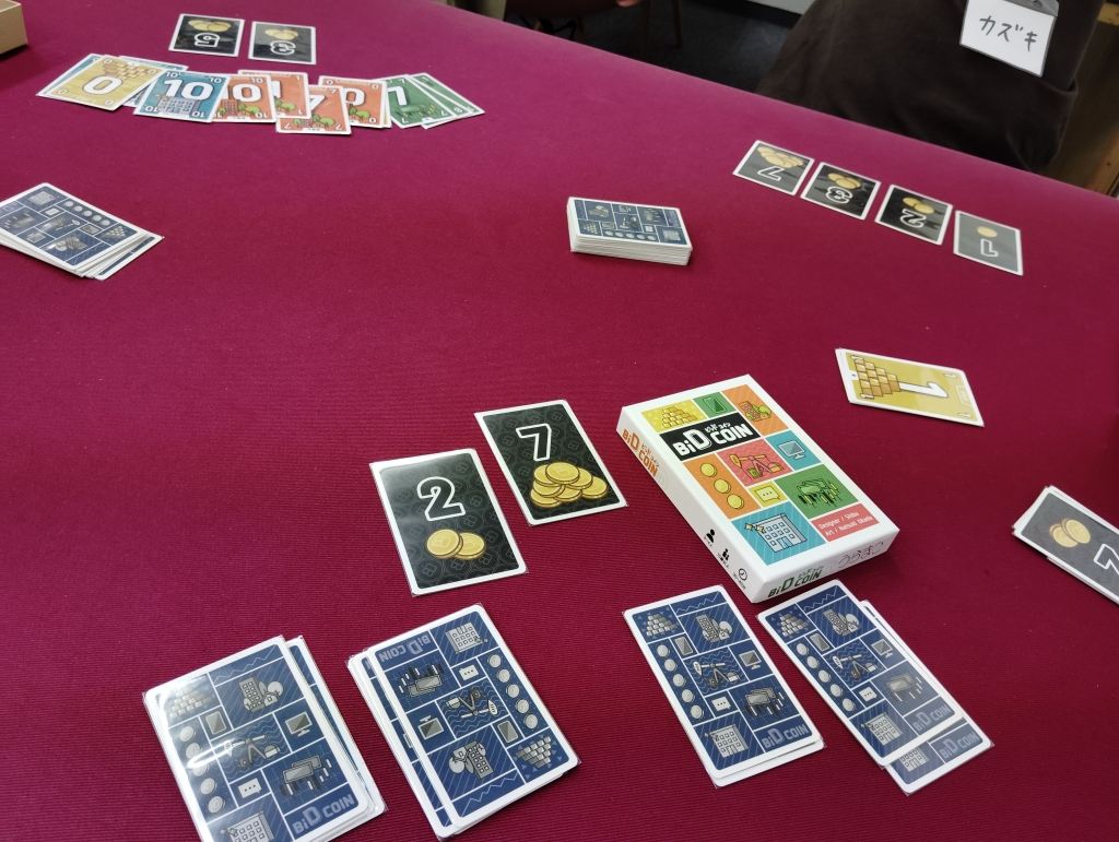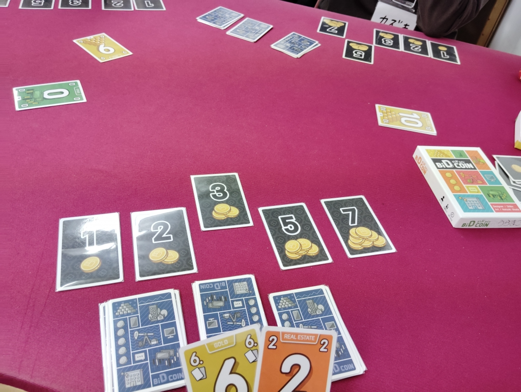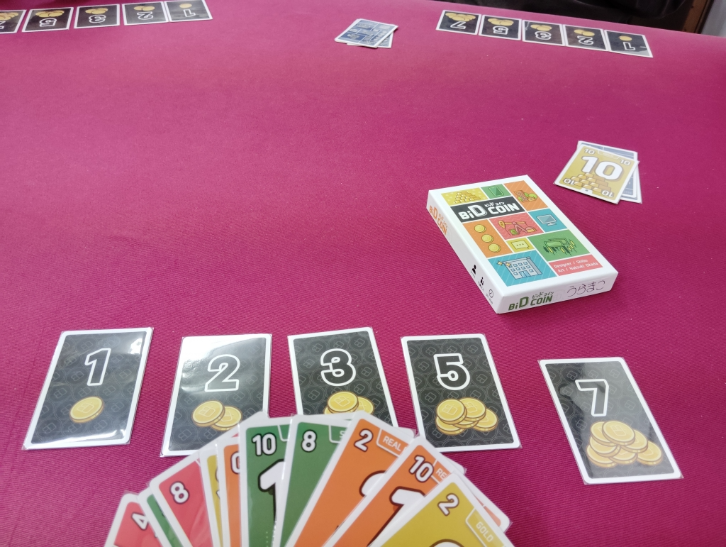 ビッドはおもにトリック獲得にすることになり、1トリック獲得すると目の前にある1、2、3、5、7のビッドコインカードから1枚を選び少しズラします。