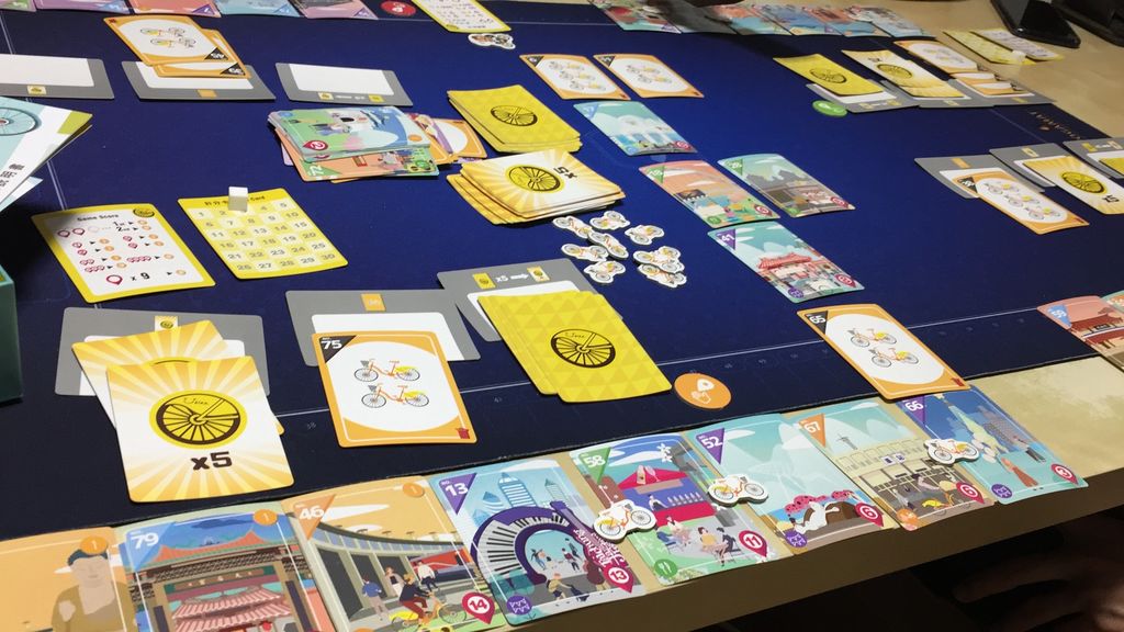 台湾の観光地を自転車で回ろう、という観光地ゲームです。うまくカードを集める必要がありますが、早めに確保してしまうか、ギャンブルでもう少し様子を見るか、選択が重要になっています。