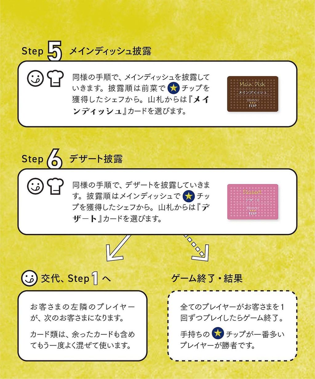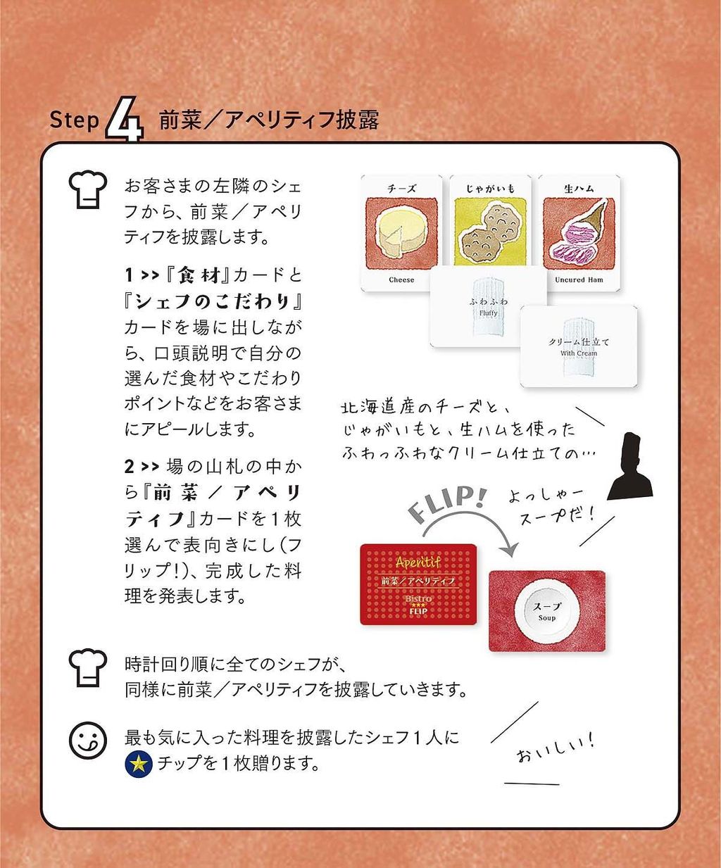 4・5・6:「シェフ」は「お客さま」にレシピをプレゼンし、料理の仕上げとして「料理カード」をフリップ(めくる)して、料理を披露していきます。「お客さま」は最も気に入った料理を作った「シェフ」に「星チップ」を1枚渡します。