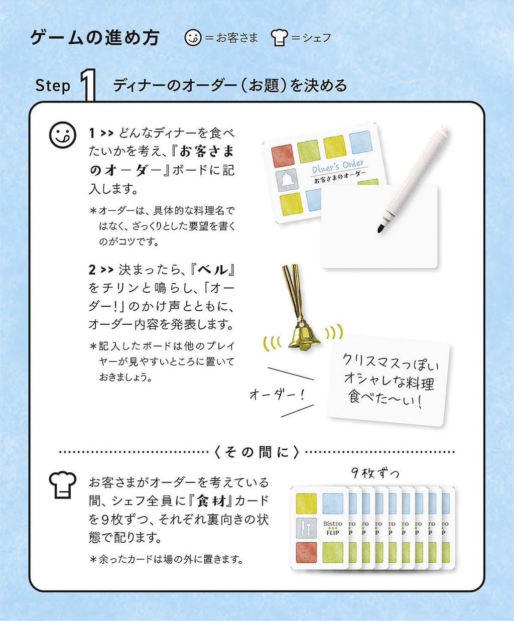 1:「お客さま」は、ディナーのオーダー(ゲームのお題)を決め、発表します。