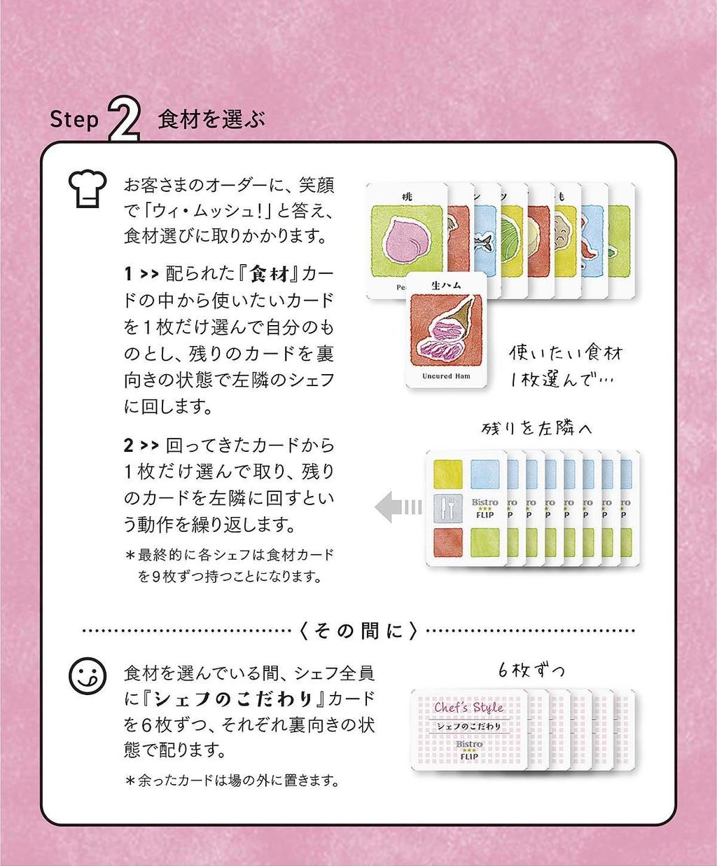 2:「シェフ」は、使いたい「食材カード」を選びます(ドラフト)。その間に「シェフのこだわりカード」が配られます。