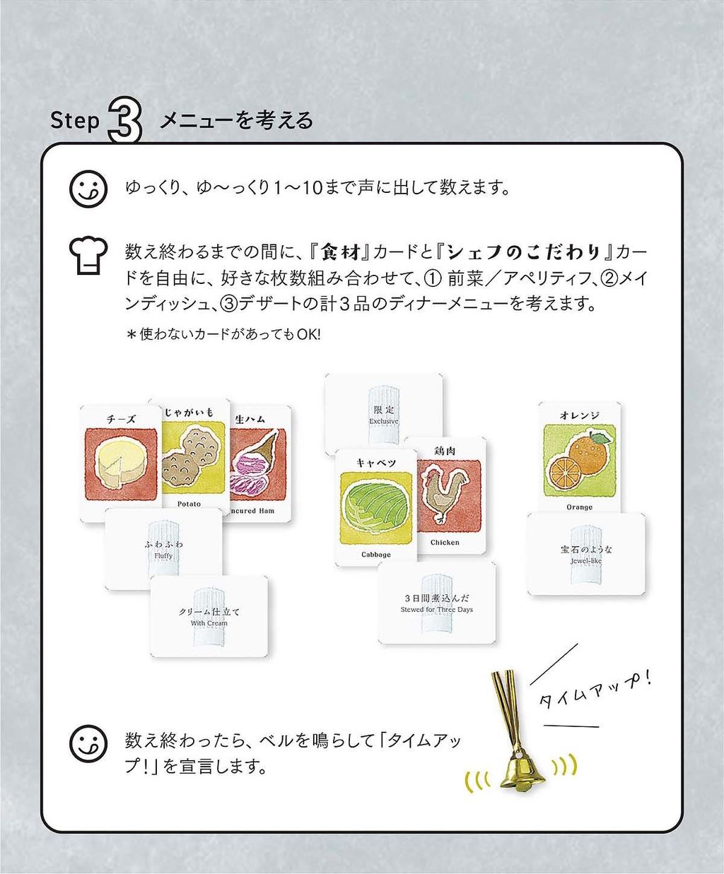 3:「お客さま」がゆっくり10数える間に、「シェフ」は「食材カード」と「シェフのこだわりカード」を組み合わせてレシピを考えます。