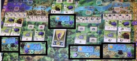 これを5ラウンド行うと・・・個人ボードはこうなります。巡礼者を解放した場所や建物を建てた場所から得点が入り、岩倉を見続けていた巡礼者の数x岩に描かれたアイコンを持っていると得点が入ります。(アイコンは建物、御霊の種類、妖怪カードがあります)