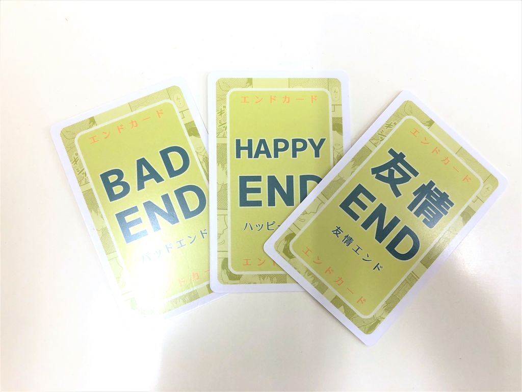手札からカードを使っては山札から補充して、を繰り返すと、最後のほうに仕込んであったエンドカードのどれかを引きます。そしたらあと一周して終わりです。引いたエンドカードになるように進めないといけないんですが、どれも同じ確率で出ます…ハッピーエンドは3分の1。悲しい……。私が遊んだときは友情エンドを引きました。