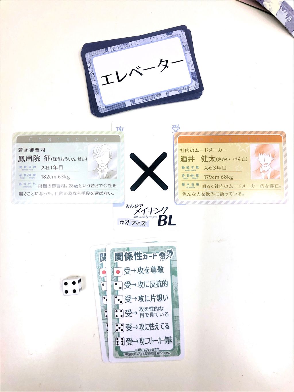 登場人物を2枚引いて、関係性をダイス振って決めて、シチュエーションカードを引きます。キャラクターカードはあと10枚くらいあって、配達員のような社外の人もパターンもありました。ブランクカードまで。