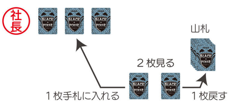1.手番の社長は、山札の上のカード2枚を見て、その中を1枚を手札に加えて、