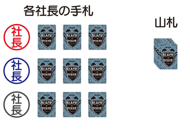 1.全てのカードをよく混ぜて、各社長に裏向きで3枚ずつ配ります。
