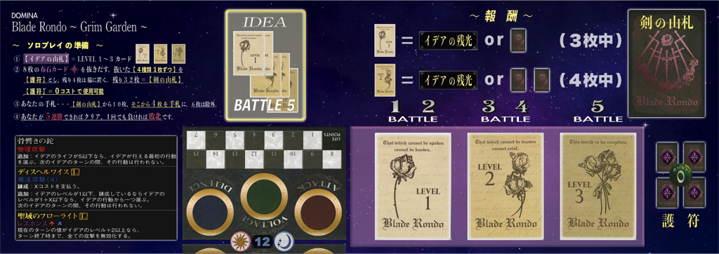 ただ、最初の(自分の)手札が4枚と護符4枚(布石カード)の計8枚と少なく、一戦勝利するごとに敵(イデア)カード(の能力)を入手するか、新たな剣カードを補充するかの選択でけっこう迷います。また、自分を守ってくれる「護符カード4枚」は使い切りの為、いかに 護符4枚(布石カード)を (敵が強くなる)後半戦まで温存して戦えるかが 鍵 になります。