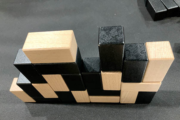 『KWINTY』はブロックを交互に置いて壁を作っていく。横と高さは最大9×9マスまで置くことができる。また、同じ色の短い辺同士が接するように置いてはいけない。