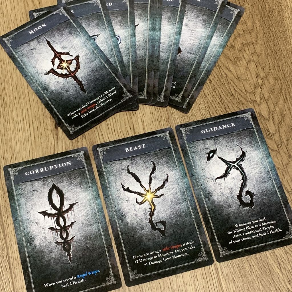 Bloodborneカードゲームの拡張パックです。新たに38枚のアップグレードカード、17枚のモンスターカード、8枚のボスカード、8枚のラスボスカードに加え、12枚のカレル文字カードとデストークンチップが入っています。以下に新たなルールなどを記載しておりますので、参考にしてください。出来るだけ分かりやすいように画像を付けました!