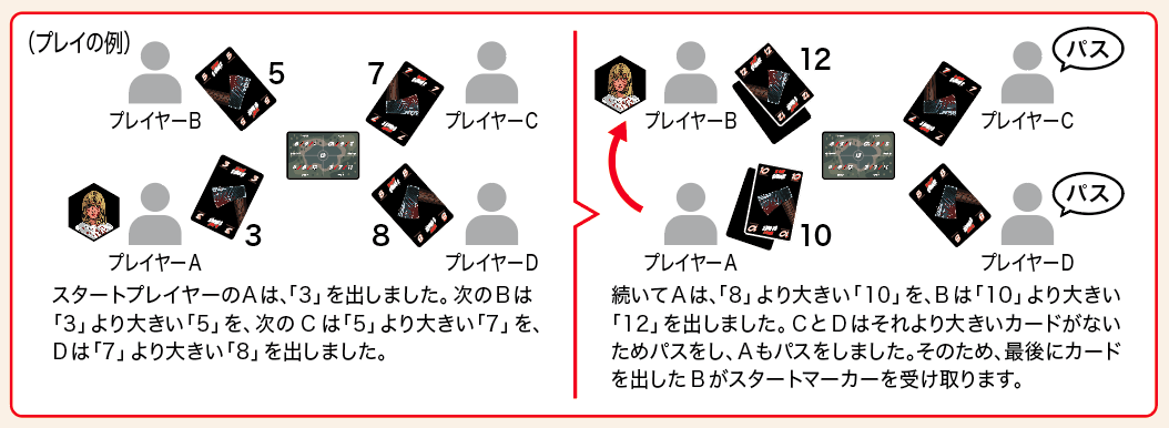 スタートマーカーを持つプレイヤーから時計回りに手番を行い、前のプレイヤーが出したカードより強いカードを出していきます。数字カードはそれぞれ自分の前に出していきます。