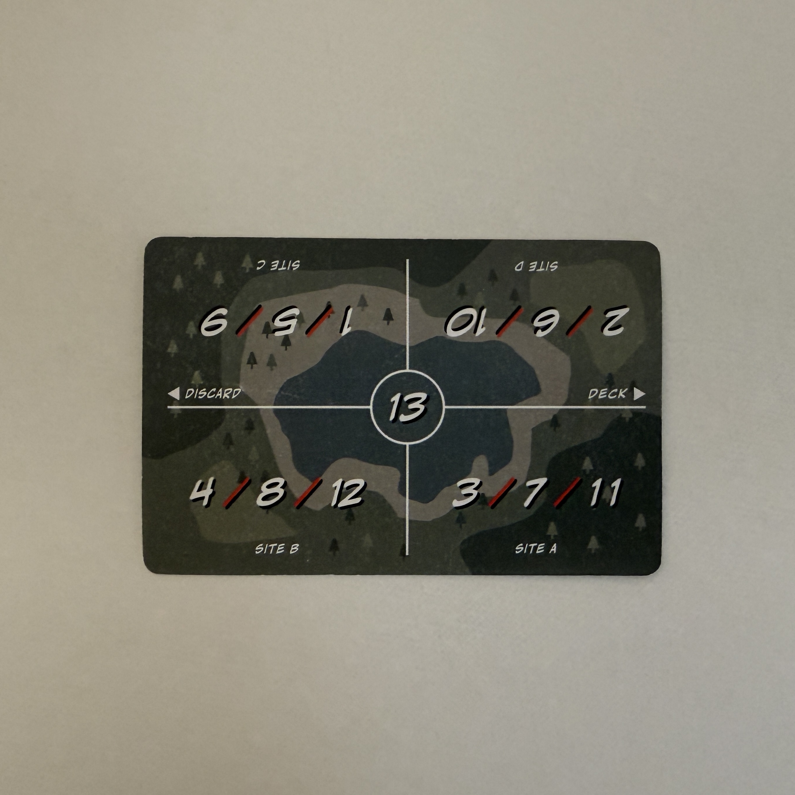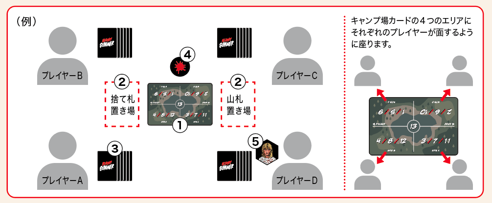 キャンプ場カードをテーブルの中央に置きます。このカードは4つのエリア(「SITE A」~「SITE D」)に分かれています。各プレイヤーは話し合って、それぞれ異なるエリアを選び、そのエリアに面するように座ります。