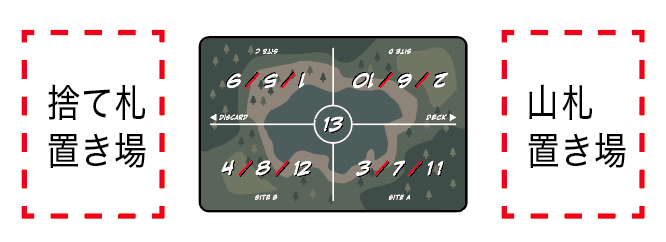 3人で遊ぶ場合も、準備の内容は変わりません。各プレイヤーは担当するエリアを選んで位置につきます。数字カードは各プレイヤーに13枚ずつ配り、余ったカードは使用しないため、捨て札置き場に置くか、ゲームから除外してください。