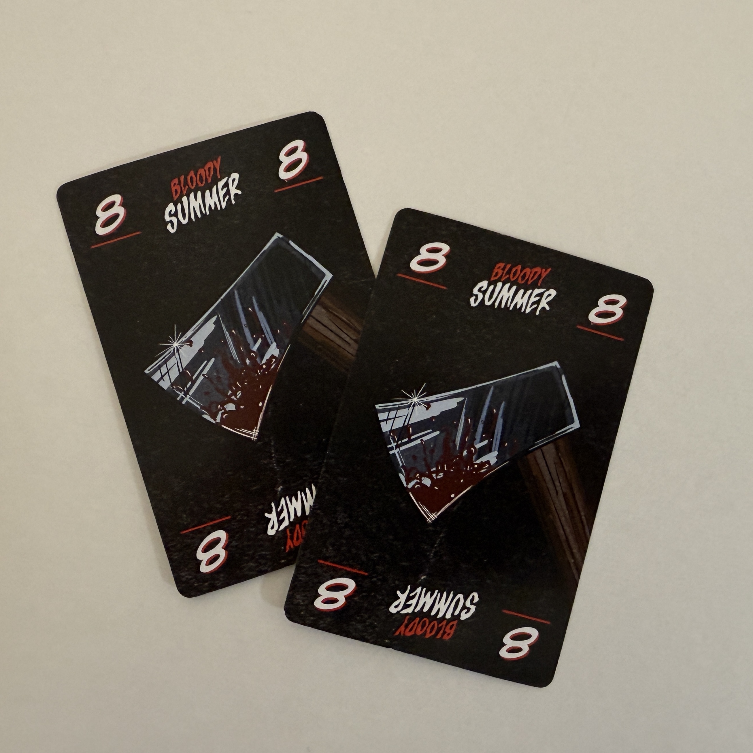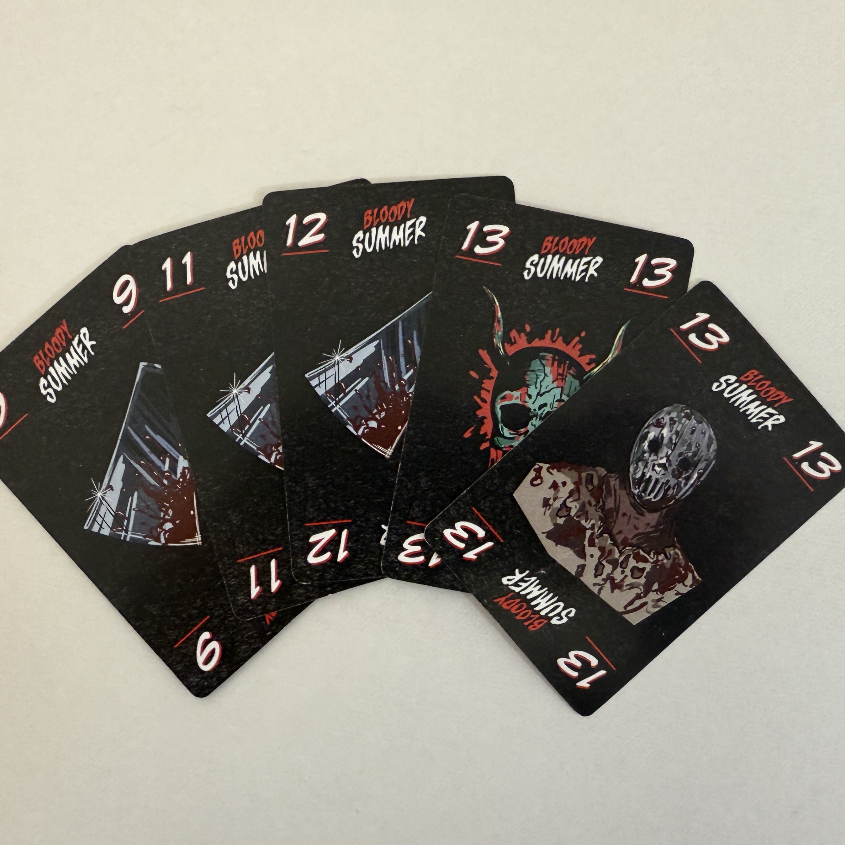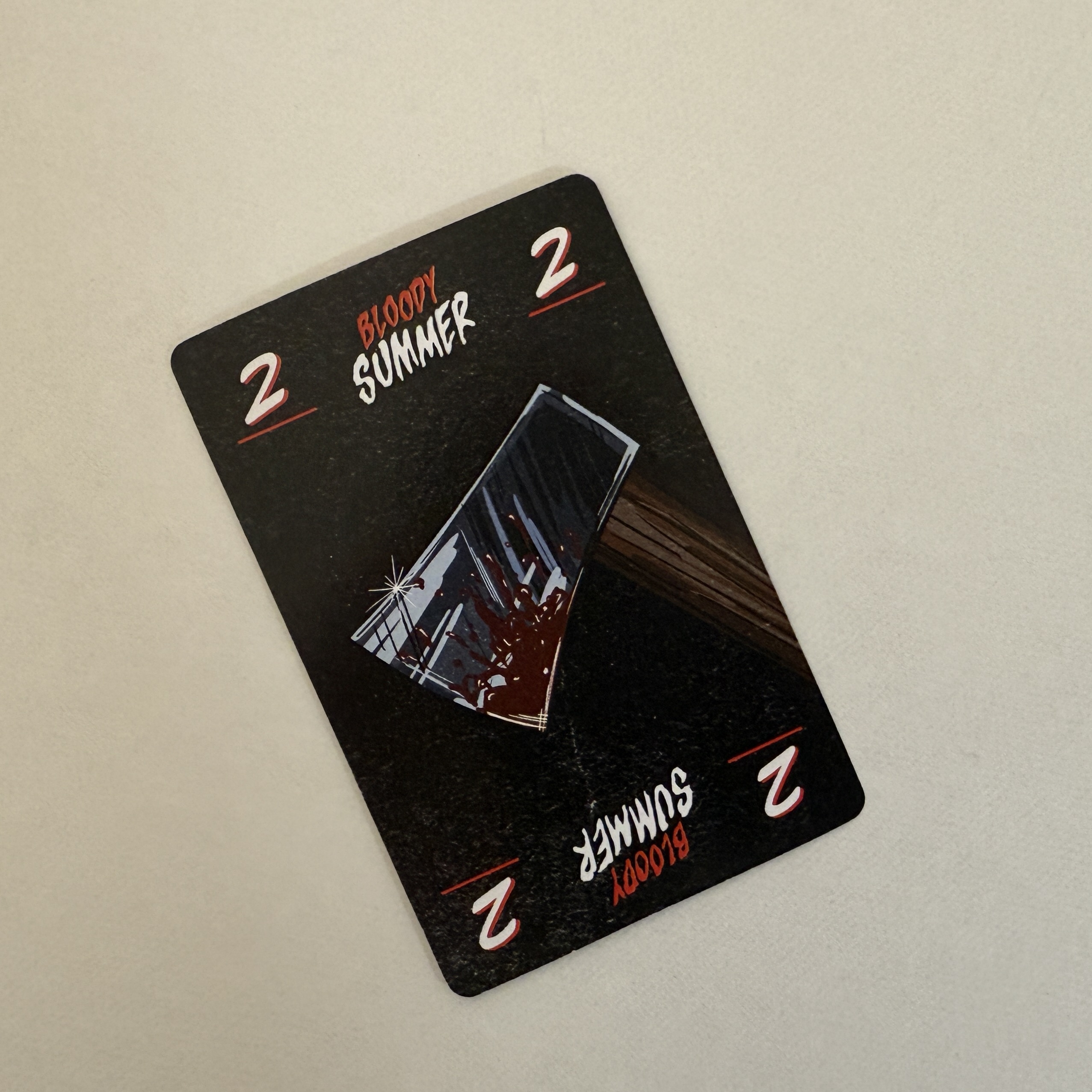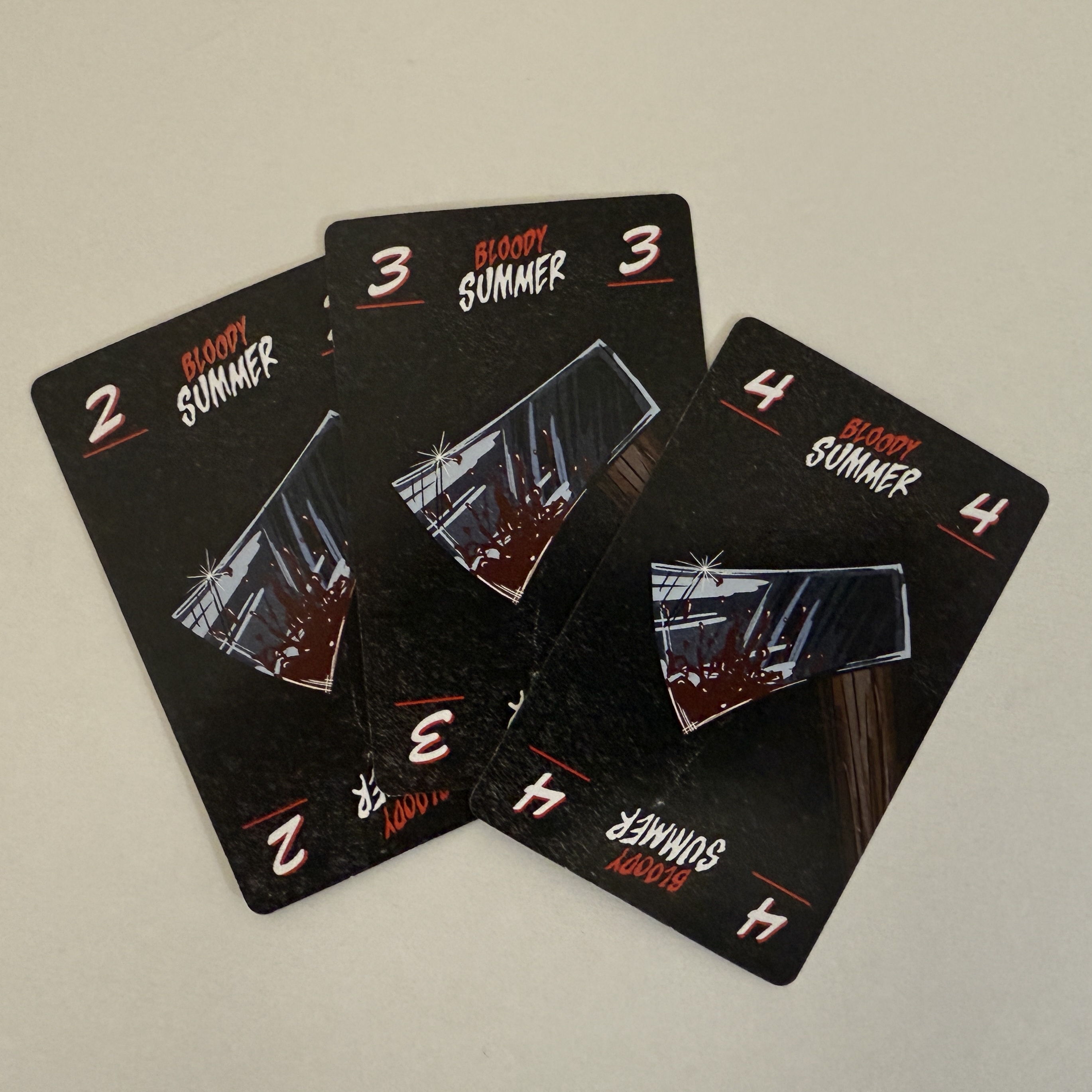 「BLOODY SUMMER」は3~4人で遊ぶ大富豪系ゲームです。夏のキャンプ場に現れた殺人鬼から生き延び、他の誰よりもいち早くこのキャンプ場から脱出しなくてはなりません!無事に脱出するには、手札のカードを全て出し切ること。もしくは、自分以外の全てのプレイヤーが殺人鬼により殺害されることです。