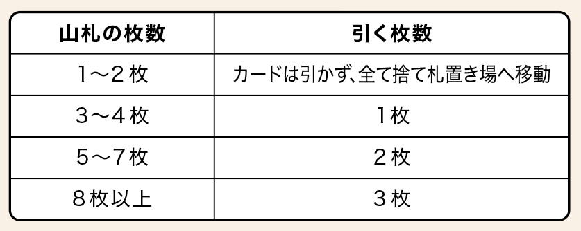 スタートマーカーを受け取ったプレイヤーは、山札から指定の枚数分カードを引き切ります。引く枚数は山札の枚数によって変わります(図を参照)。
