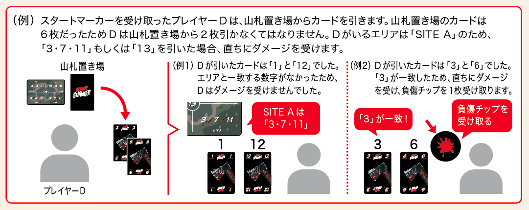引いたカードが条件に一致しなかった場合は、ダメージを受けずに判定を終えます。ダメージを受けた場合は、共通の場にある負傷チップを1枚受け取り「負傷状態」となります。もし負傷状態で、以降のラウンドで殺人鬼からの攻撃を受けた場合、その時点でそのプレイヤーは「殺人鬼に殺害」されたとしてゲームから脱落となります。脱落したプレイヤーは、以降のラウンドに参加することができなくなります。脱落した場合、全ての手札を「捨て札置き場」へ移動させ、スタートマーカーを左隣のプレ イヤーに渡します。ダメージは1ラウンドに1回までしか受けません。そのため山札から複数枚引いて、複数の数字が一致した場合も負傷チップは1枚しか受け取りません。