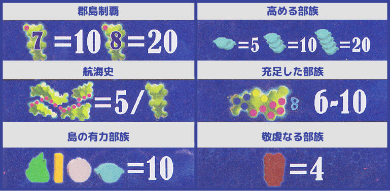 - 郡島制覇:8つの陸地マスに部族・村コマを配置しているプレイヤーは20点/7つの島なら10点。