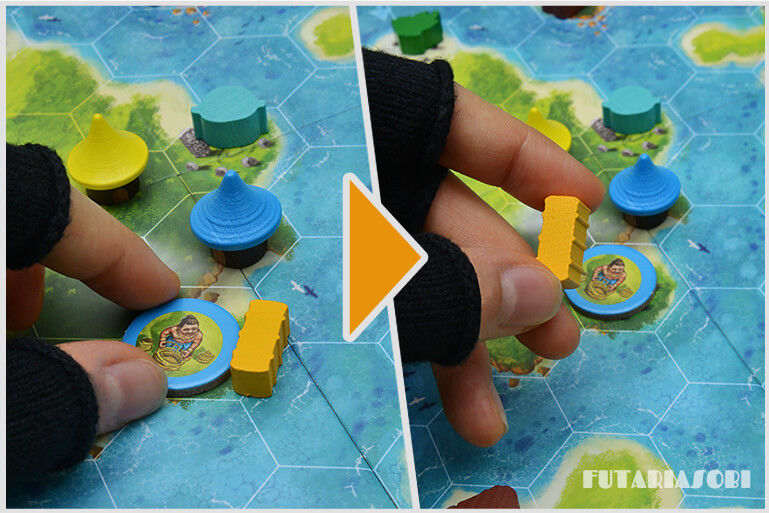 探索・移住フェイズでは、プレイヤーは交互に自分の部族コマもしくは村コマ1個をボード上の空いているマスに配置する。