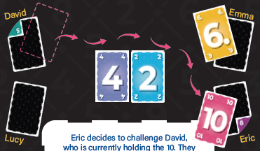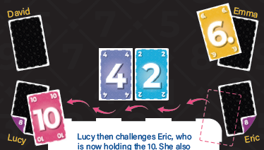 その後、ルーシーは現在10を保持しているエリックに挑戦します。彼女も8をプレイしていますが、同数は挑戦側が勝つため、エリックに勝って10を取ります。 |