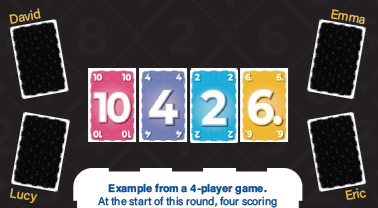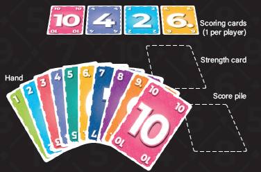 1から10までの数字のカード10枚をシャッフルし、プレイヤー数に等しい数のカードを表向きにテーブルに置きます。これらは、最初のラウンドで使用される得点カードです。残りのカードは脇に置き、もう使用されません。スタートプレイヤーを決めます。