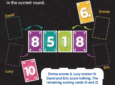 エマは6点、ルーシーは10点を獲得します。デビッドとエリックは何も得点しません。残りの得点カード(4と2)はゲームから削除されます。ルーシーは最高得点のカードを獲得したため、スタートプレイヤーとなります。 |