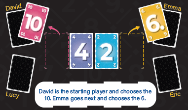 デビッドはスタートプレイヤーで、10を選択します。次にエマは6を選択します。 |
