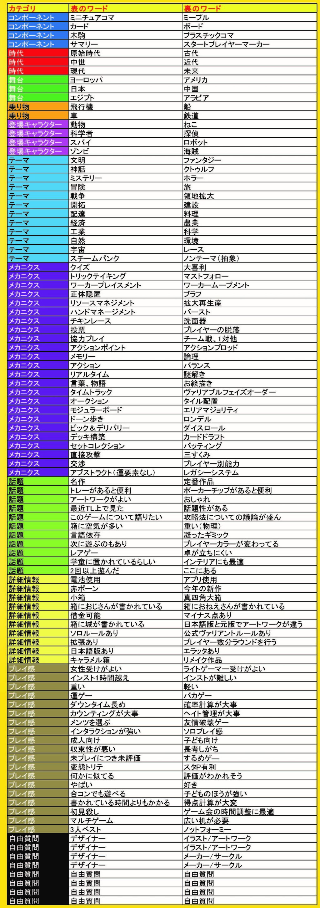 メカニクス:クイズ、大喜利、トリックテイキング、マストフォロー、ワーカープレイスメント、ワーカームーブメント、正体隠匿、ブラフ、リソースマネジメント、拡大再生産、ハンドマネージメント、バースト、チキンレース、洗面器、投票、プレイヤーの脱落、協力プレイ、チーム戦、1対他、アクションポイント、アクションプロッド、メモリー、論理、アクション、バランス、リアルタイム、謎解き、言葉、物語、お絵描き、タイムトラック、ヴァリアブルフェイズオーダー、オークション、タイル配置、モジュラーボード、エリアマジョリティ、ドーン歩き、ロンデル、ピック&デリバリー、ダイスロール、デッキ構築、カードドラフト、セットコレクション、バッティング、直接攻撃、三すくみ、交渉、プレイヤー別能力、アブストラクト(運要素なし)、レガシーシステム