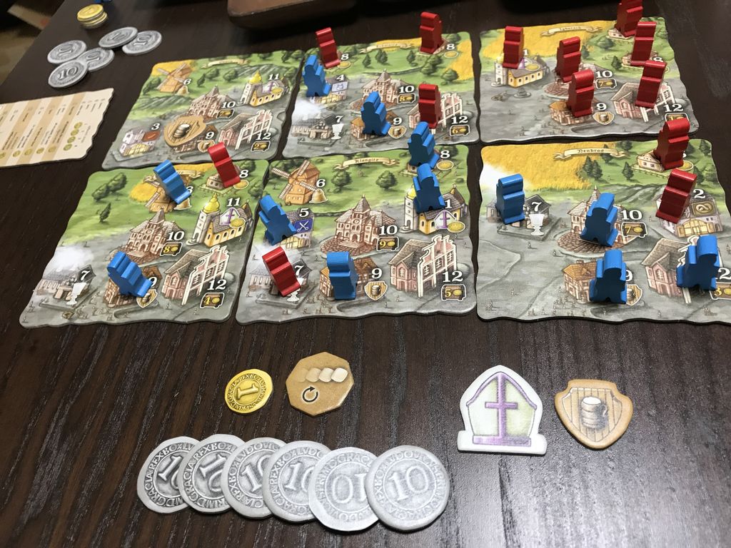 途中、コマを置くことによりすぐにお金が手に入ったり、中間決済を起こしてお金を手に入れたり、終了時に建物の占有率等でお金が手に入ったり。
