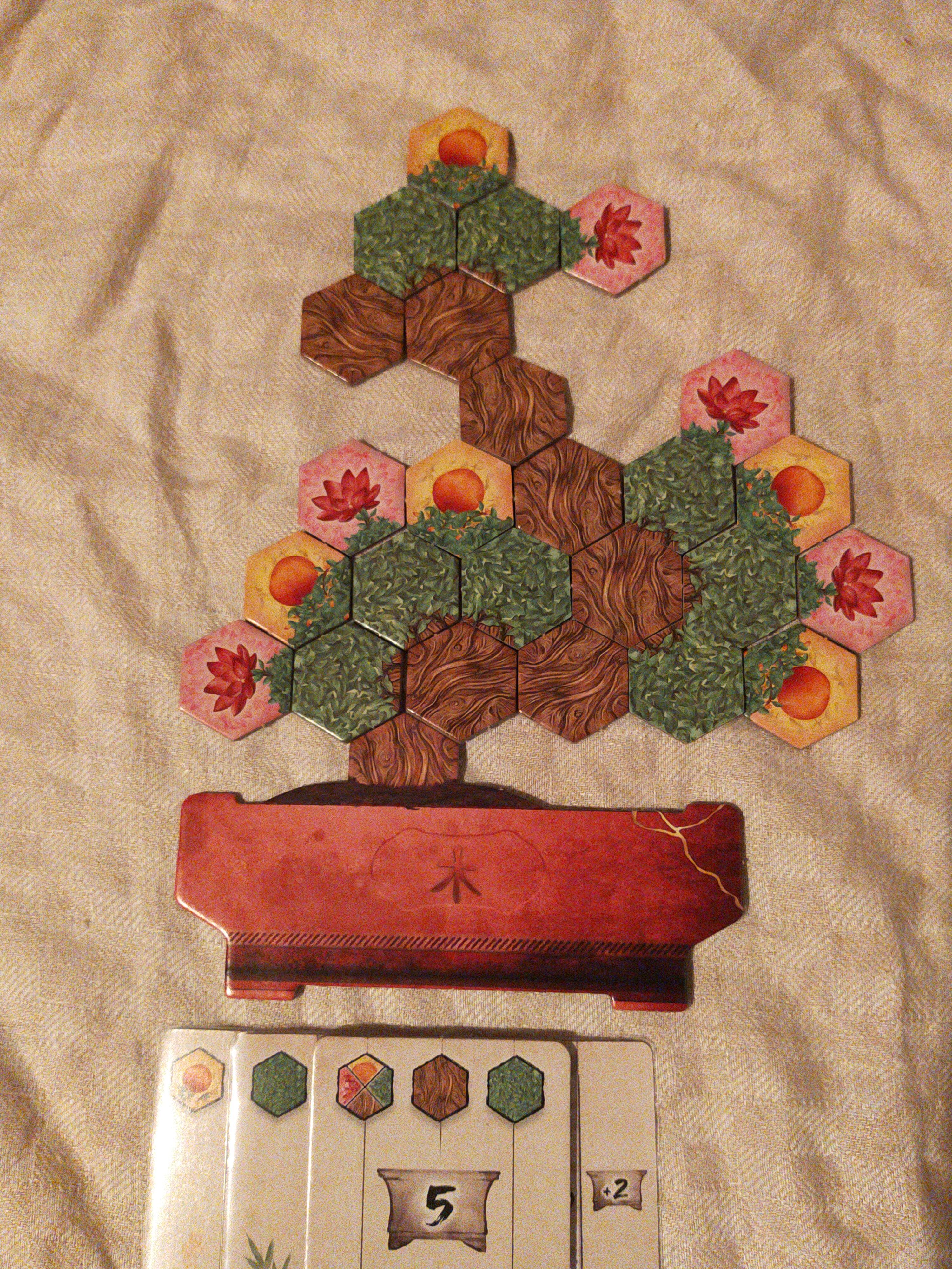 毎ゲームごとに変わる早取り制の目標タイルもあり、例えば鉢から左右にはみ出したタイルを要求するものがあれば、画像の中央下2つのような様式(『懸崖』とか『斜幹』とか)も生まれてくる。