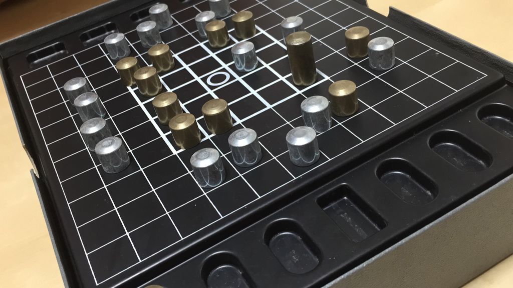さて、金色のプレイヤーは「艦隊に囲まれたプレイヤー」で、銀色のプレイヤーは「囲んだプレイヤー」です。金色は、1つ高いコマ、司令官コマを言います、をボードの端まで移動させれば勝ちです。