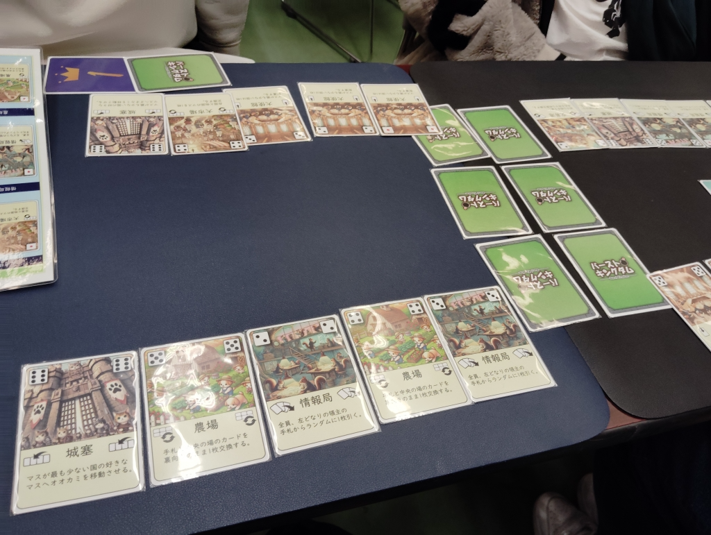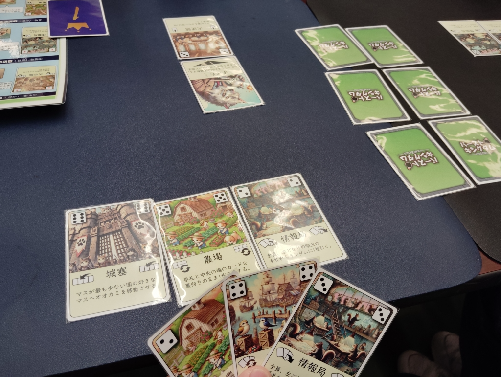 効果は個人だったり全員だったりして、手札交換や場札や建物交換、オオカミの移動とかになります。