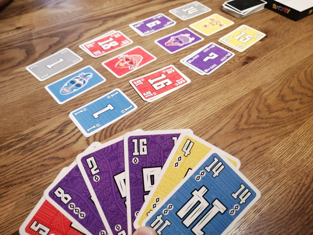 すべてのカードが1枚ずつしかないので、カウンティングと無いやろう読みでプレイする楽しみがあるのと、カードをプレイする際に、直前のプレイヤーがプレイしていた色のカードをプレイしたら山札からカードを1枚引かないといけないルールが効いていました。