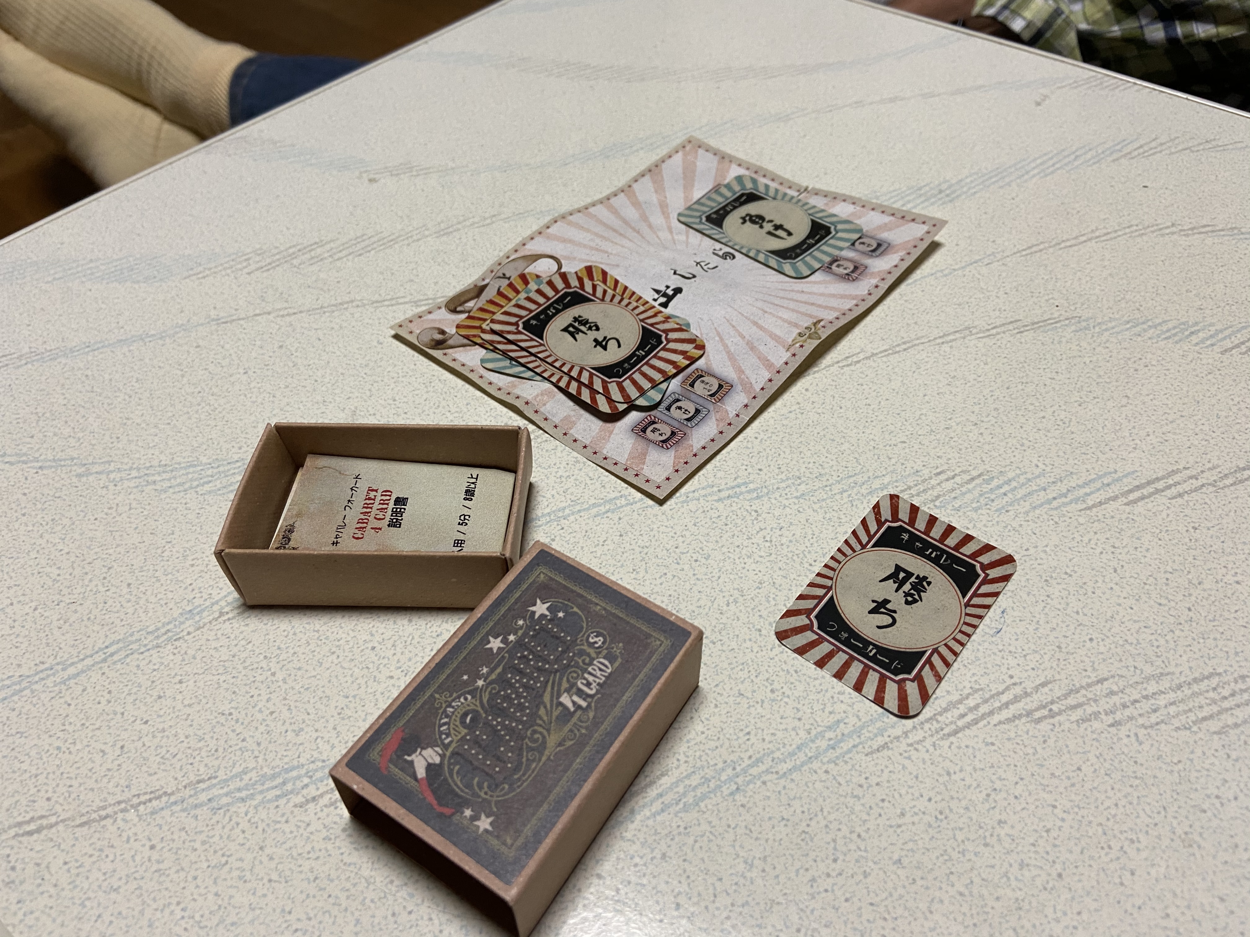 …と思っていたんだけど、いざやってみるとこのくらいでも全く問題なし!むしろポケットから箱を出すと「え!何これゲームなの!?」みたいに食いついてもらえるから、このサイズはかなりアリかも。むしろトランプくらいの大きさの方が逆にくどい気がしてきた…。