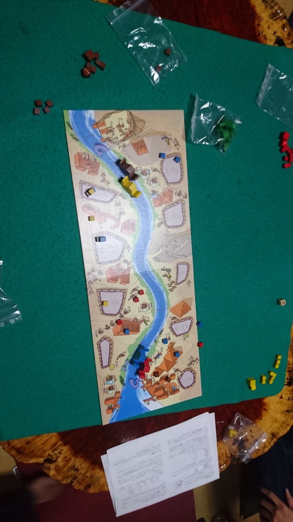 サイコロで出た目分、船を進めて、親指から順番にサイコロの出目の指で建材を弾いて何箇所かある建築現場に投げ込む。川に落ちたりボード外にふっ飛ばしたら建材は没収される、他人のキューブを弾き飛ばすのもアリ。