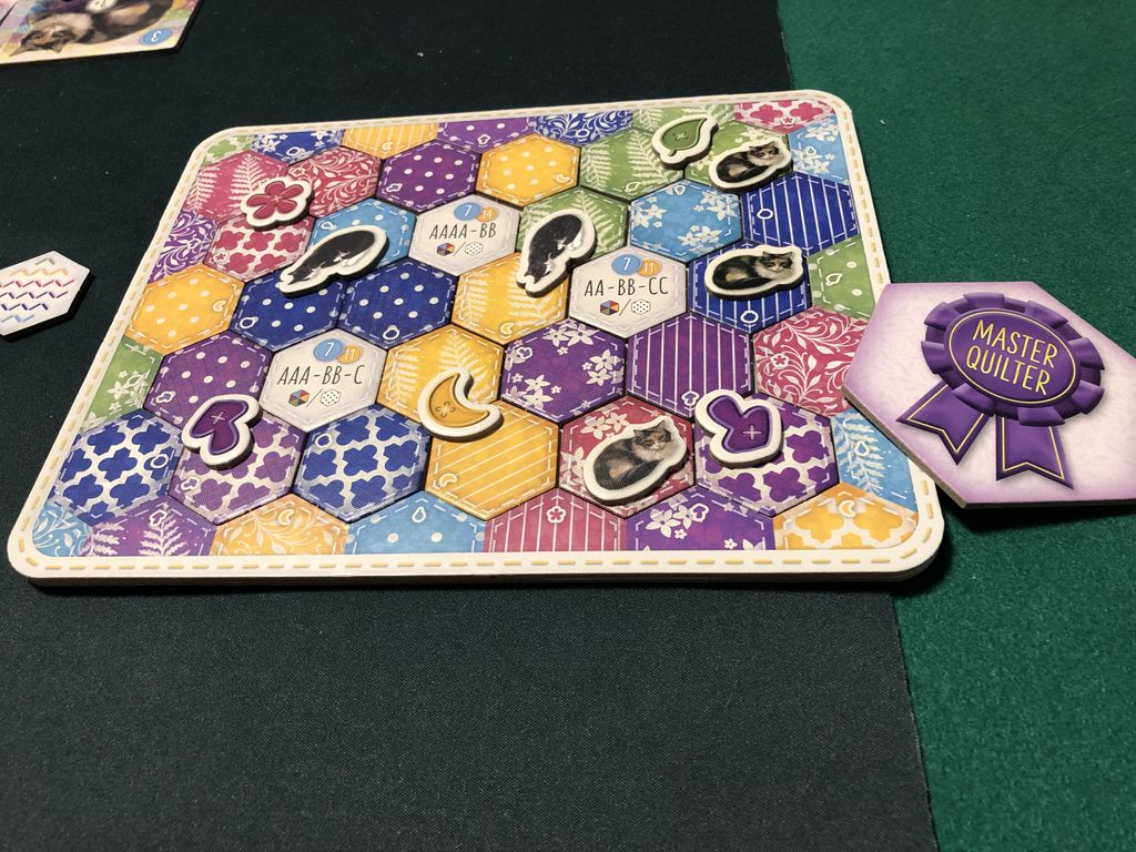 布に見立てたプレイヤーボードに様々な模様のタイルを敷くことによって、完成したパターンによる得点を得るゲーム。個人目標と全体目標があり、個人目標は6種類ある中から4種類をランダムで引き、更にそこから3種類を選択する。個人目標タイルのチョイスや置き方によっては同時達成が不可能なものが出てきてしまうのでそこは要注意だ。