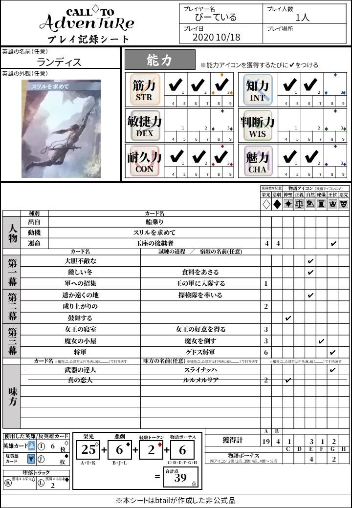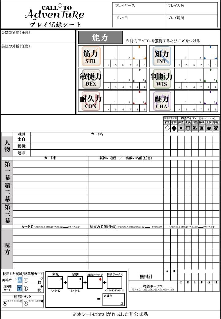 プレイごとに様々な出自と来歴を持つ英雄を生み出せる素敵なゲーム「コール・トゥ・アドベンチャー」。せっかく誕生した英雄を記録に残しておけるといいなー、と思って作成したプレイ記録シートを公開します。
