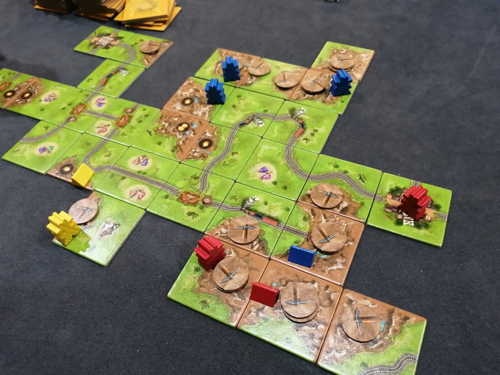 今回は道ではなく線路となっていて1タイルにつき1点は同じですが、タイルには列車が描かれているタイルもあり、線路が完成した際に列車が1つだけなら得点が倍になります。