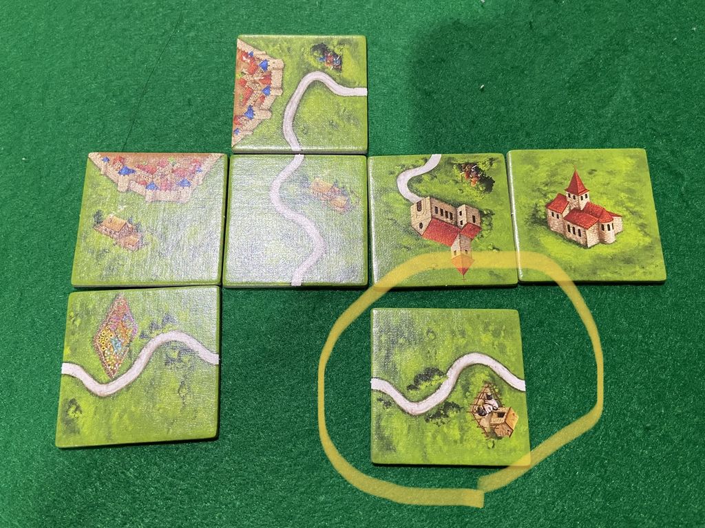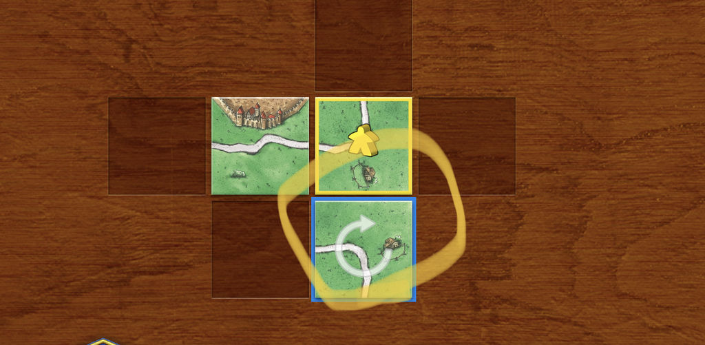 ②の状況ですが先に道タイルを置いてある横(道タイルなら道が繋がる状態)で新しい道タイルを草原の面と先の道タイルの道とくっつけて道が完成しないようにするのです。
