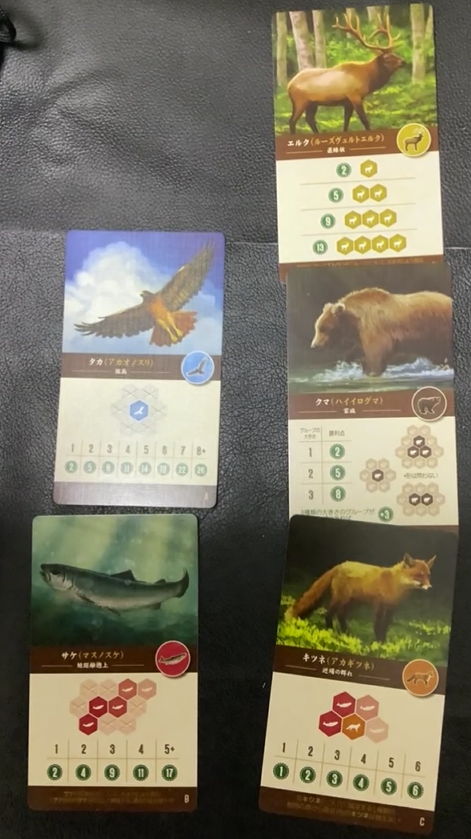 各動物の得点条件のカードに沿ってタイルを配置して動物を配置していく。この公園には5種類の動物しかいない、今後拡張が出て動物増やされても困るけど・・・