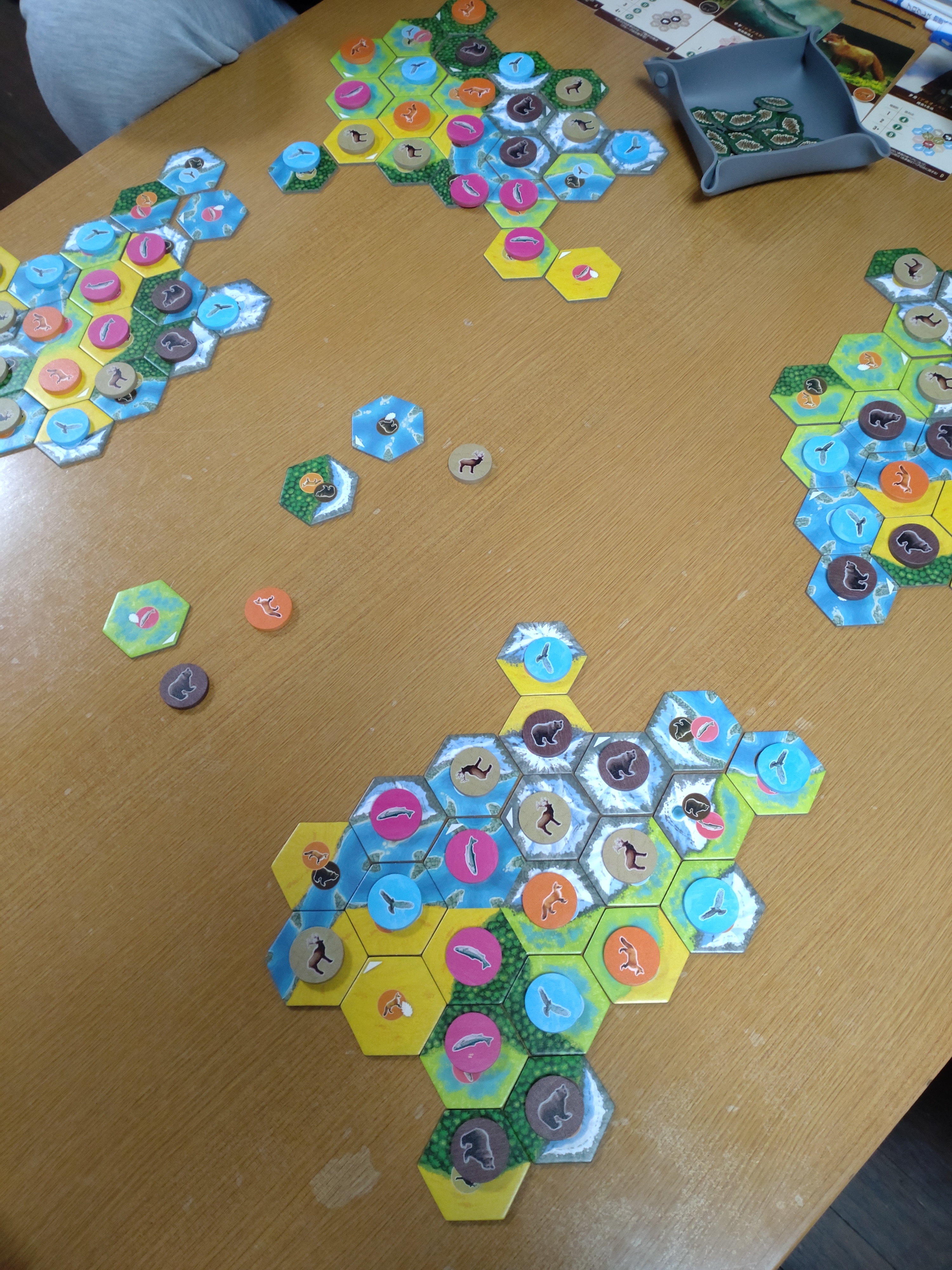 それから勝利点の計算では、環境ごとに最も大きなエリアの数が重要になります。そのため、それぞれの環境をかたまりとして配置することで、より多くの勝利点を獲得することができます。また、他のプレイヤーと比較して最も大きなエリアを持っていれば、追加の勝利点を得ることができますので、相手の配置している生息地タイルを注意しながら戦略を練ることも重要です。