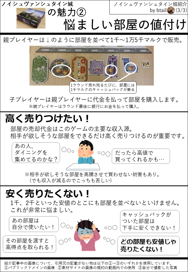 ホントはテクニカルな得点獲得方法(部屋配置による特殊効果や「王の歓心」など)も紹介したかったのですが、ややこしくなりそうなので敢えて外しています。