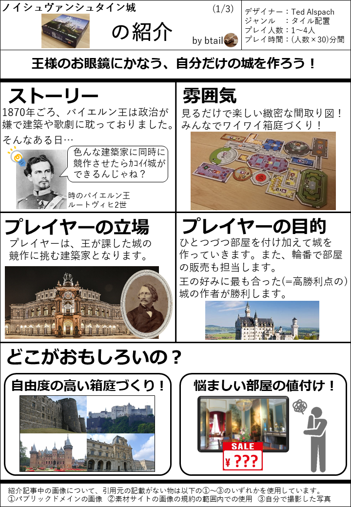 自分のボードゲーム仲間にノイシュヴァンシュタイン城を紹介するのに使った資料を掲載します。(内容は公開向けに少し直しています)