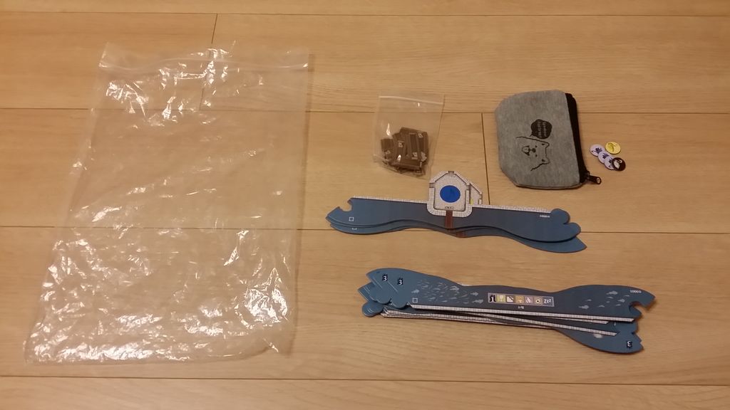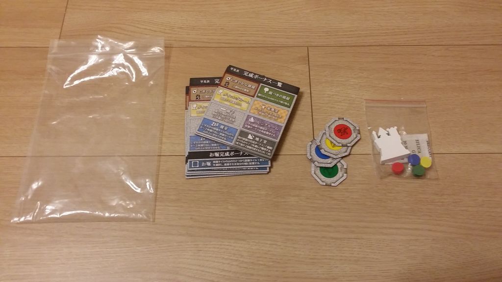 ゲーム開始時に各プレイヤー向けに用意するもの(基本と拡張の早見表カード、ロビータイル、親トークン、プレイヤーマーカー)はまとめて100均のチャック袋に。親トークン&プレイヤーマーカーは、さらにゲーム購入時に付いていたチャック袋に入れています。