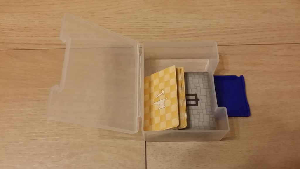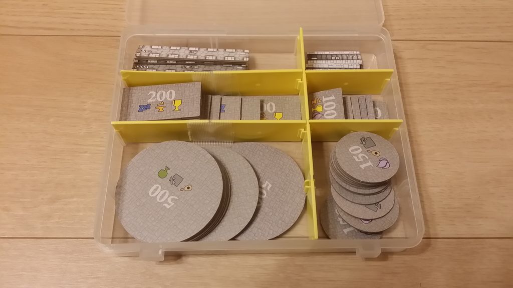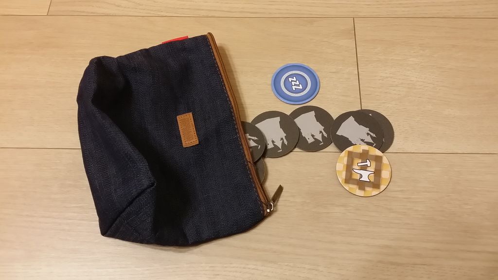 王の歓心タイルはファスナー付きのバッグに。ゲーム開始時にバッグから直接タイルを引くようにして使っています。ファスナー付きよりも巾着の方が雰囲気出るかも。