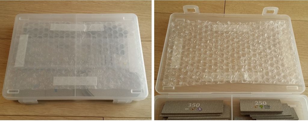 仕切りとフタの間にすこし隙間があったため、梱包材(いわゆるプチプチ)をフタの内側に両面テープで貼りつけました。これで縦置きにしてもタイルが移動することはない……はず。