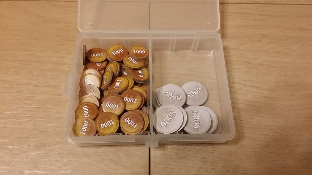 コインは1000マルクと5000マルクに分けて、セリアで購入した仕切りケース(セパレートボックスSSサイズ)に。このケースも仕切りが可動するタイプで、コンポーネント収納に便利そうです。