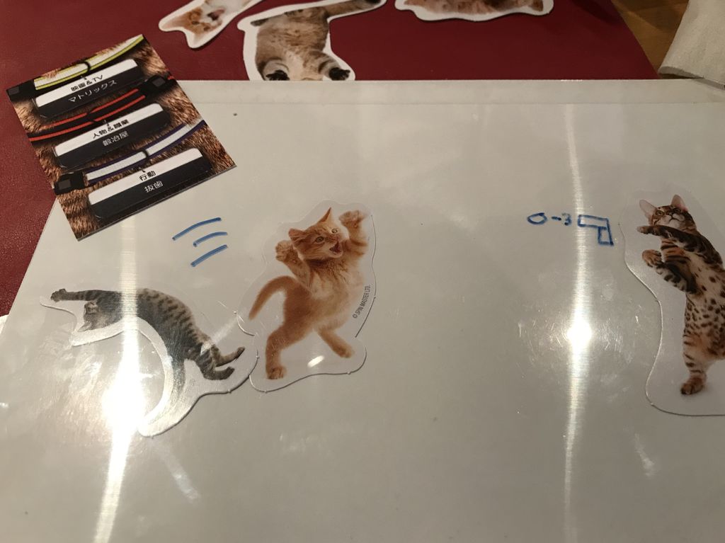 ルールは至ってシンプルでお題に『TV・映画』『俳優・有名人』『行動』のどれかを選んで猫を挟んで描いて誰かにお題の内容を当ててもらって当てたらそのプレイヤーに点数が入るというゲームです。