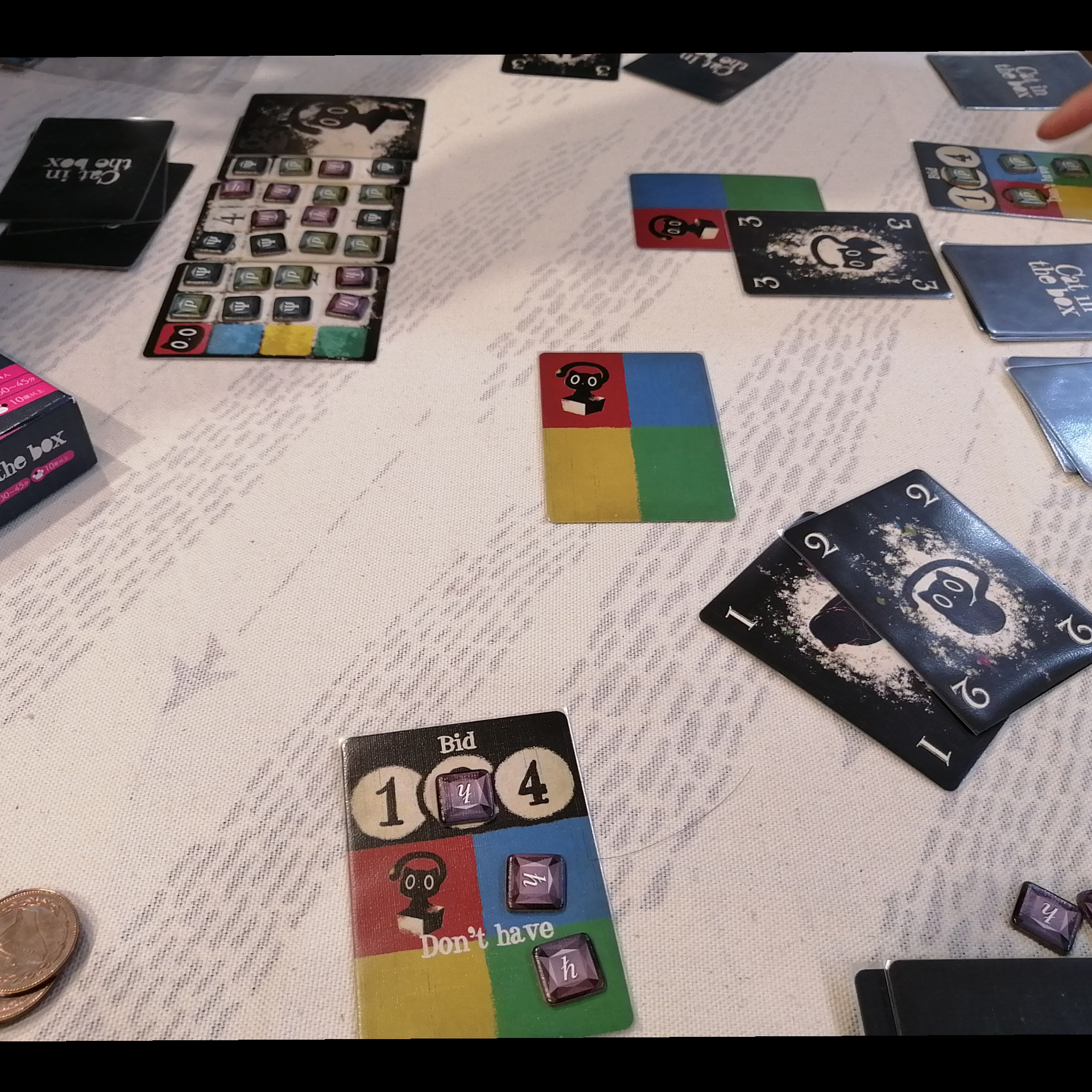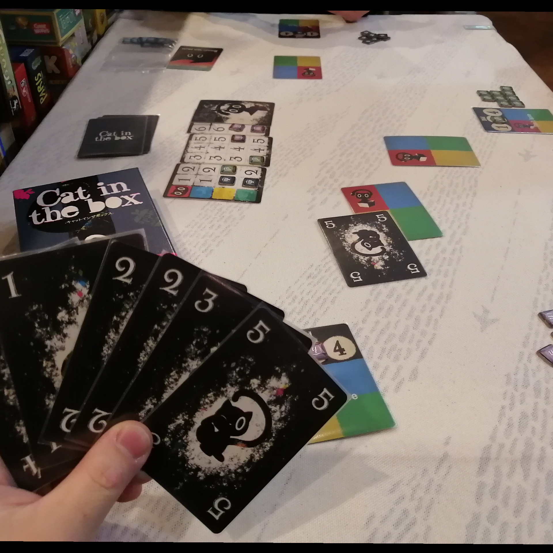 マストフォローのトリックテイキングゲームで、4色各数字は1~8(3人時は1~6)の5枚ずつなんですが、手札は真っ黒やし各数字は5枚ずつあって色は4色とか説明している時点で間違っているとか言われそうやが合っています。